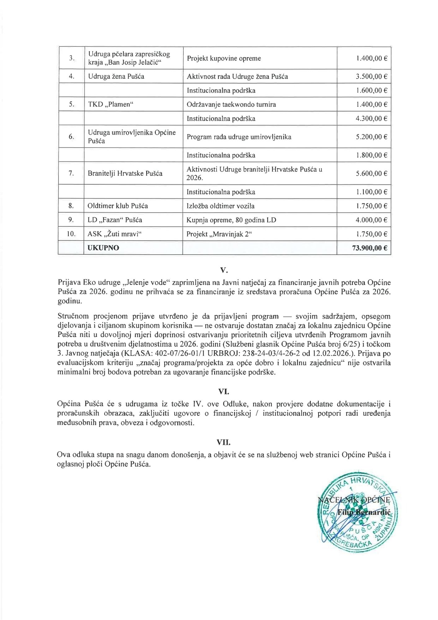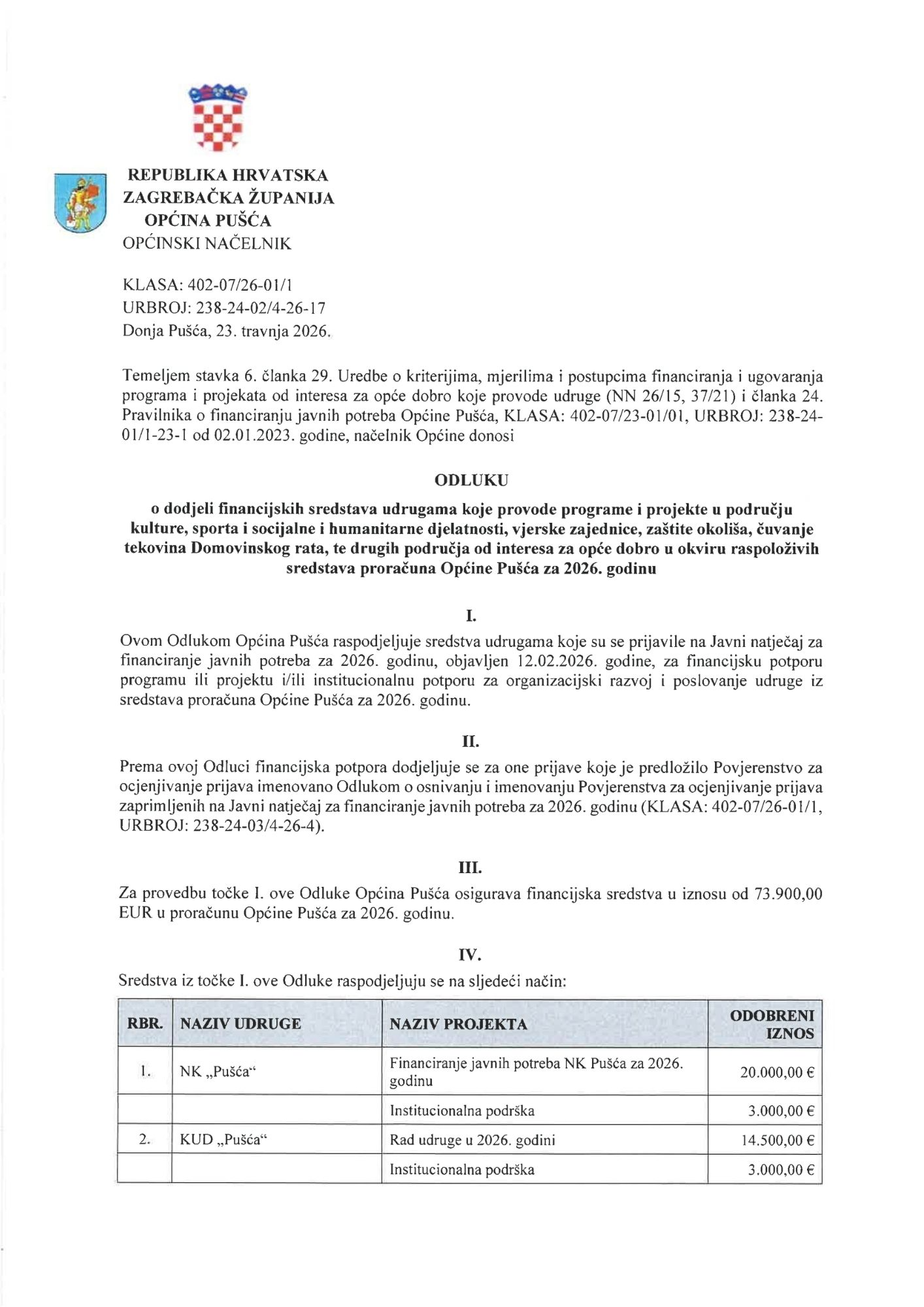 Odluka o dodjeli financijskih sredstava udrugama za 2026. godinu - Općina Pušća